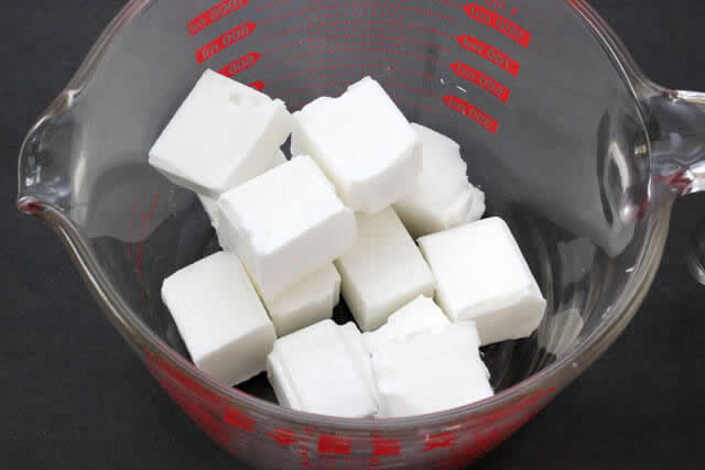 1. Pique a base glicerinada em cubinhos e reserve um pouco dela, aproximadamente 100 gramas, para fazer a segunda camada do sabonete.